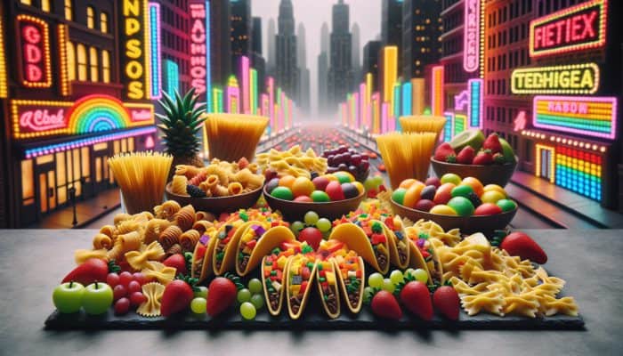 How to Enjoy Vegas Dining with Kids: Colorful kid-friendly dishes like mini tacos and whimsical pasta in a lively Las Vegas restaurant.