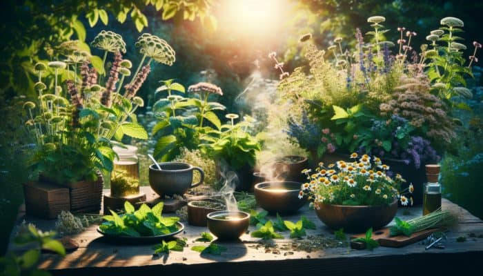 Creating Herbal Infusions for Beginners: A serene garden with mint, chamomile, and nettle plants, and steaming cups of herbal infusions.