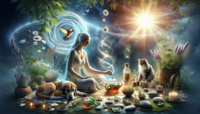 Herbal Remedies for Pets Too: A pet owner brewing herbal tea with chamomile and echinacea, dog and cat resting nearby, surrounded by nature.