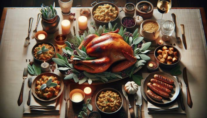 Best Herbs for Holiday Meals: A festive table with sage-adorned roasted turkey, sausage stuffing, and breadcrumbs, exuding a warm, earthy aroma.