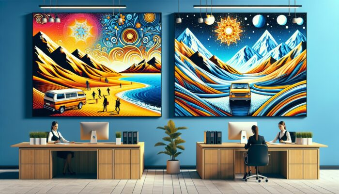 A car rental office with colourful posters showcasing summer beach and winter mountain scenes, promoting seasonal discounts.