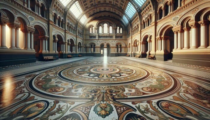 Intricate terrazzo floors in Victorian-era British architecture, seen in grand public edifices like the Natural History Museum and railway stations.