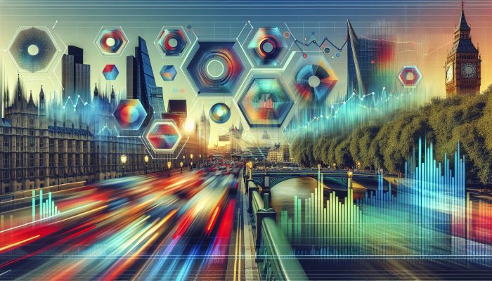 A modern dashboard showing real-time financial data with graphs and charts, set in a bustling UK city.